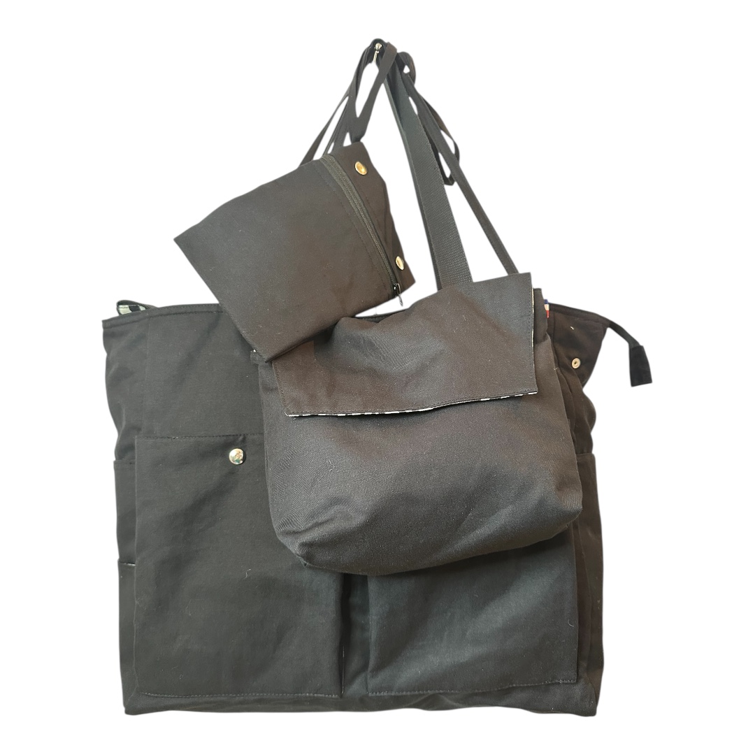3 sacs, 11 poches, 1 mousqueton, 1 bandoulière